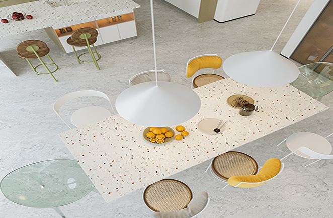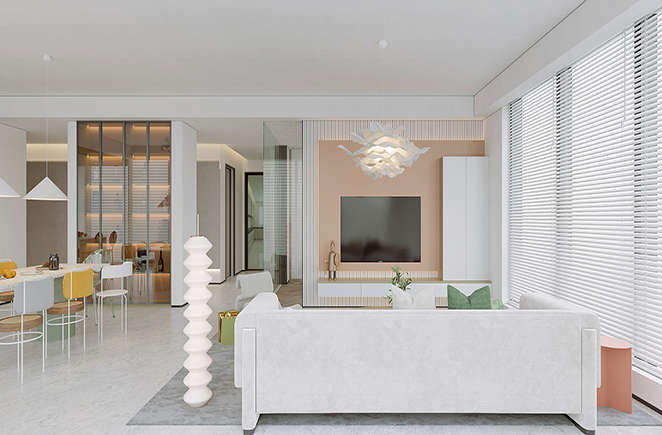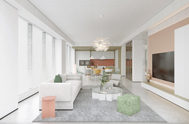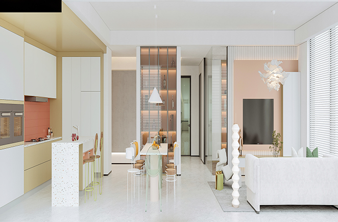 素雅的极光白花色加上具有特色的单品家具,呈现出了活泼、轻盈的空间氛围。同时位于客厅旁的空间就是厨房+就餐,采取开放式设计,让整个空间看上去更加光亮宽敞。
