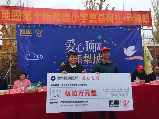 顶固手拉手爱心计划启动的第十年,第十所希望小学落户新疆。以库尔勒顶固衣柜总经理黄华为代表的顶固人作为先锋力量,极大地推动了顶固爱心公益的发展。