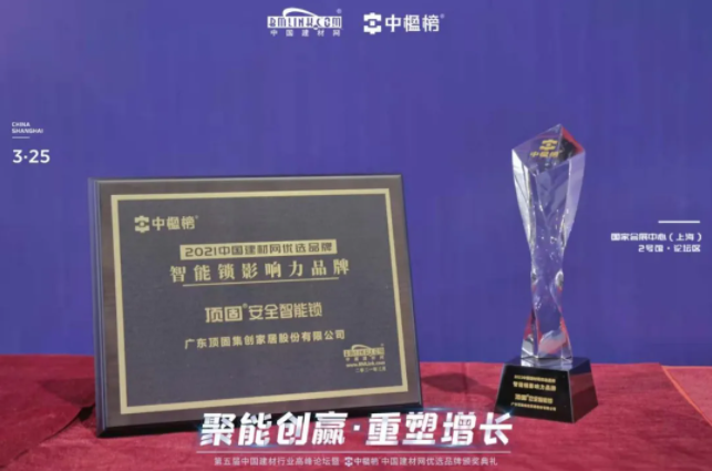 会上,顶固安全智能锁凭借自身的企业实力、技术创新能力与市场影响力,从一众优秀家居品牌中脱颖而出,荣获2021年“中国建材网优选品牌智能锁影响力品牌奖”。